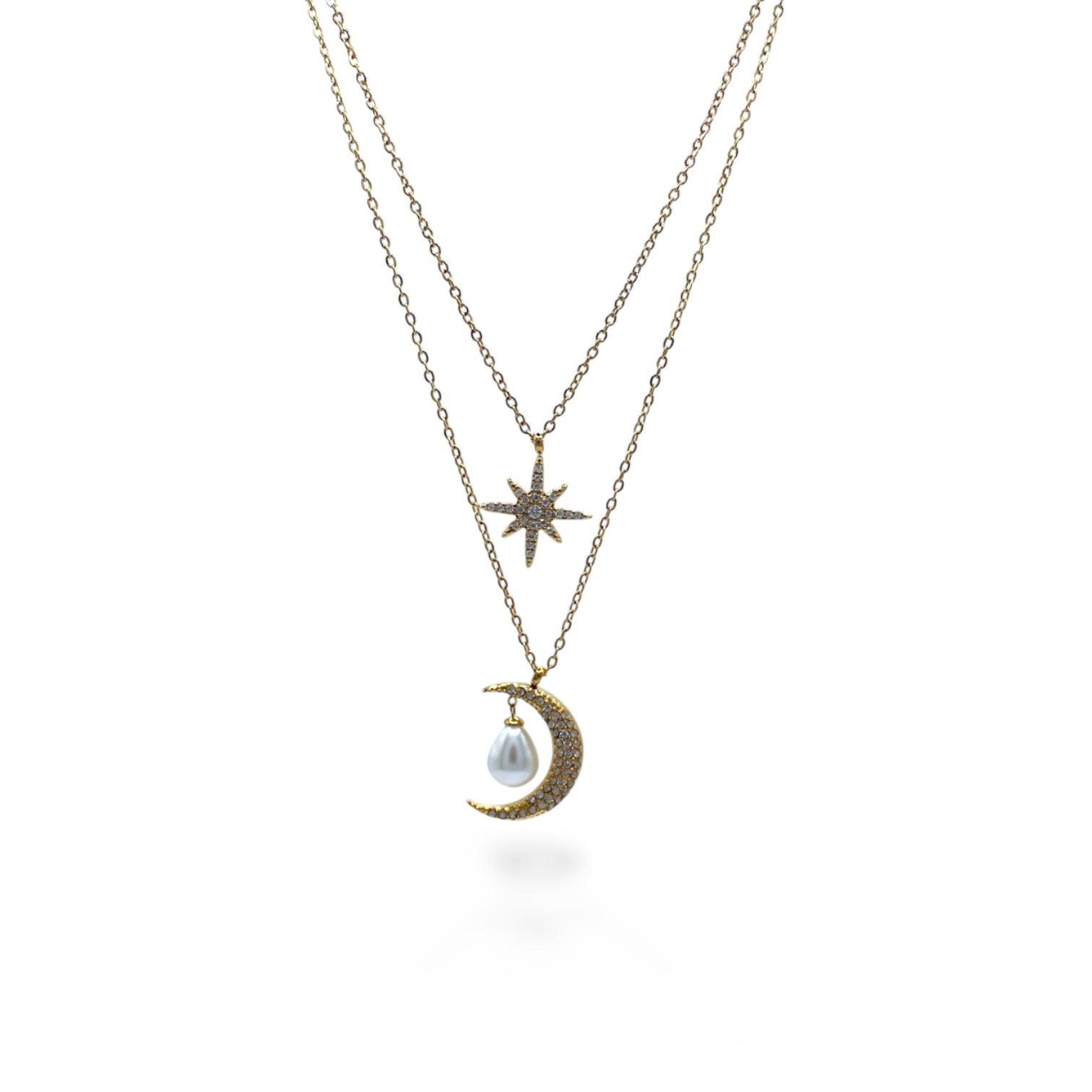 COLLAR DOBLE DESTELLO Y LUNA ZIRCONIAS CON PERLA COLGANTE
